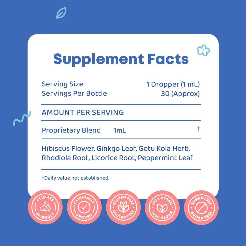 Formulated with Hibiscus Flower, Ginkgo Leaf, Gotu Kola, Rhodiola Root, Licorice Root, and Peppermint Leaf, Brain Bloom Drops gently support focus, emotional balance, and natural cognitive growth.